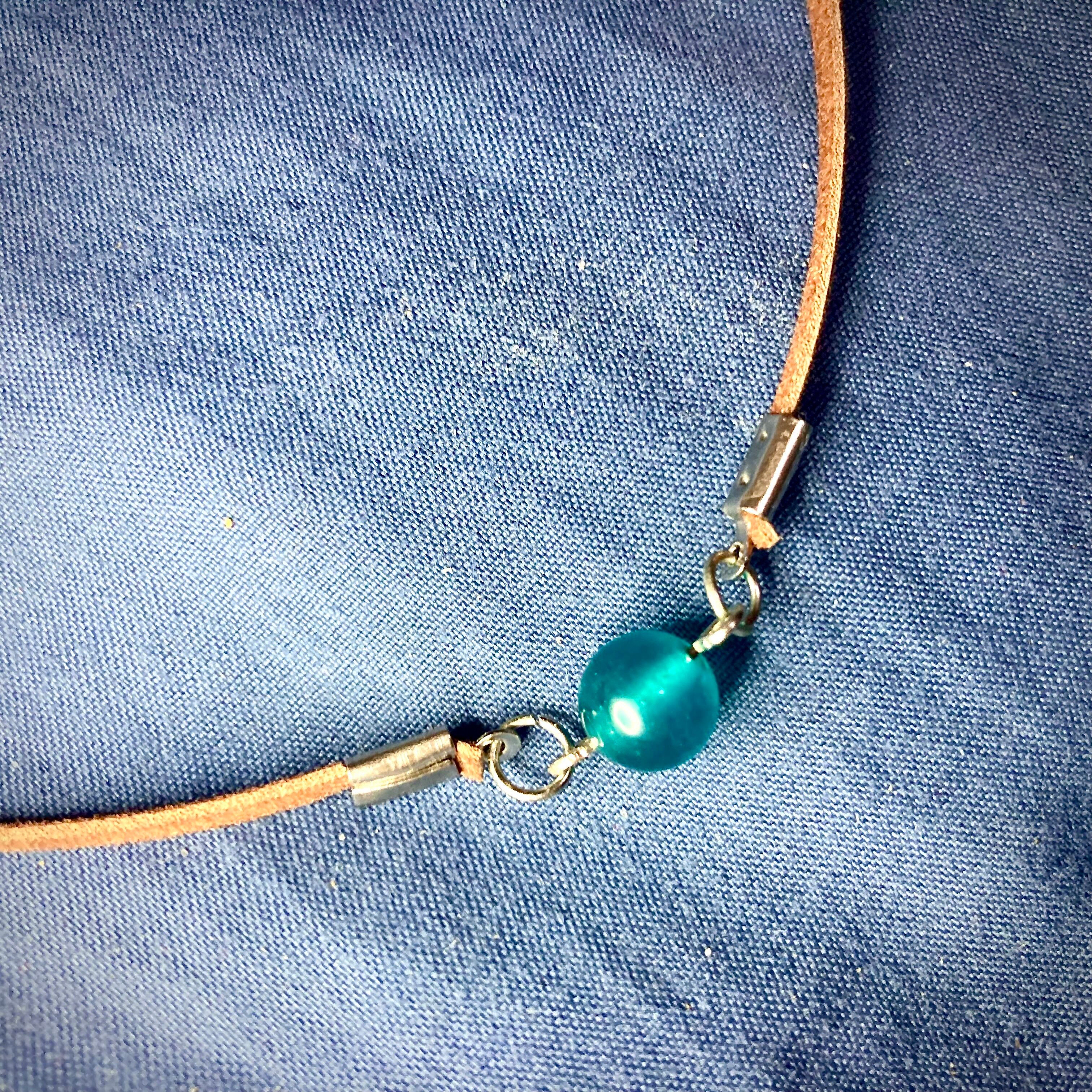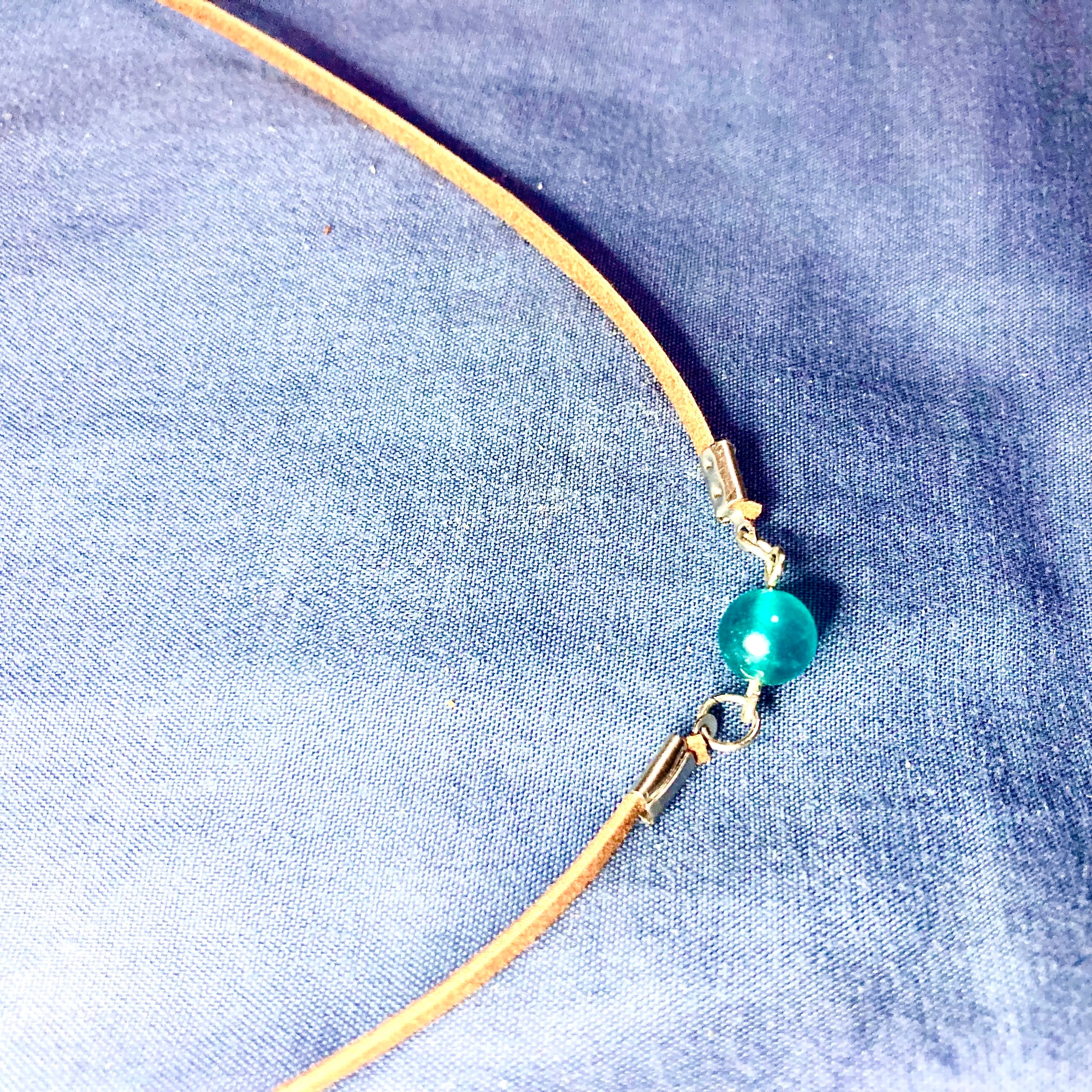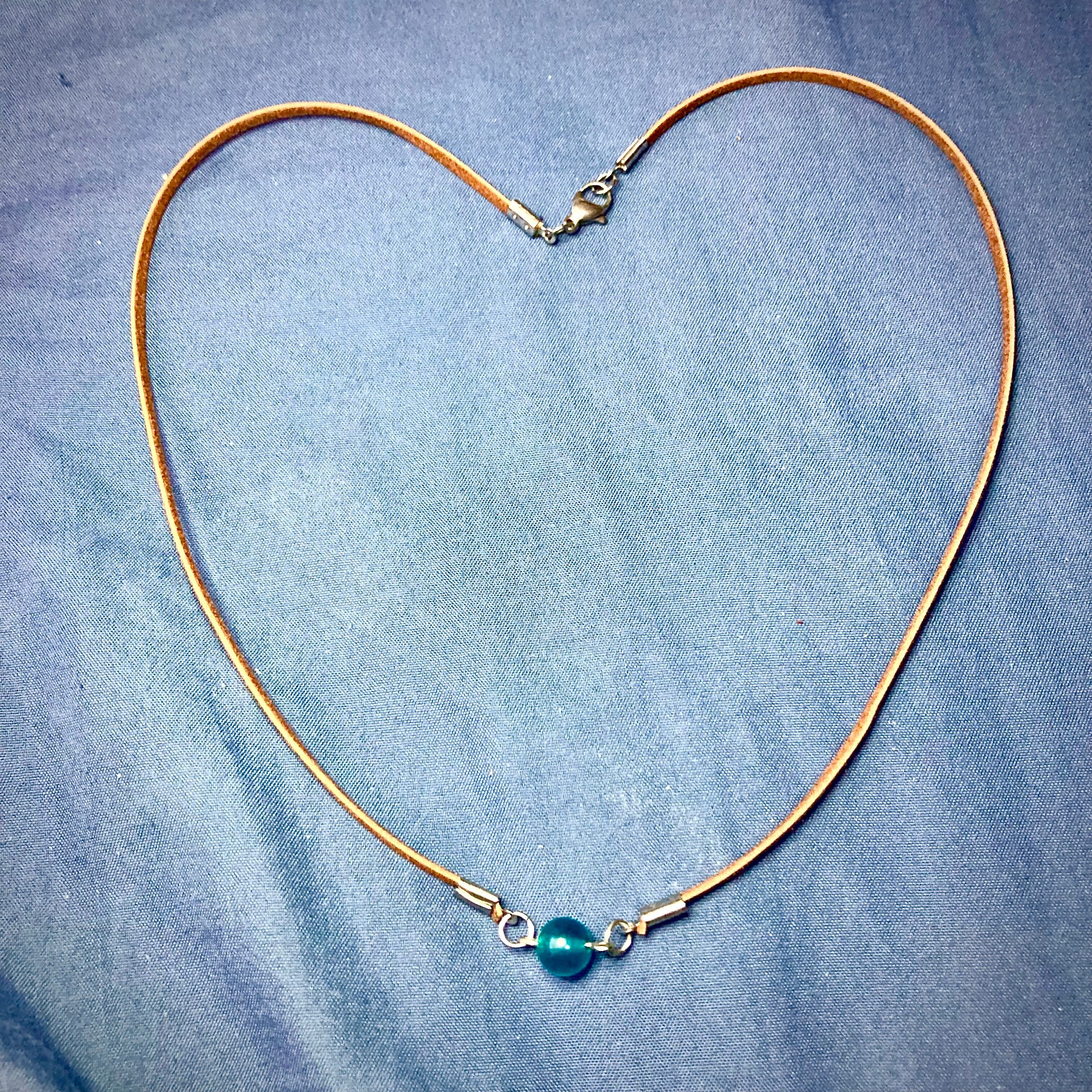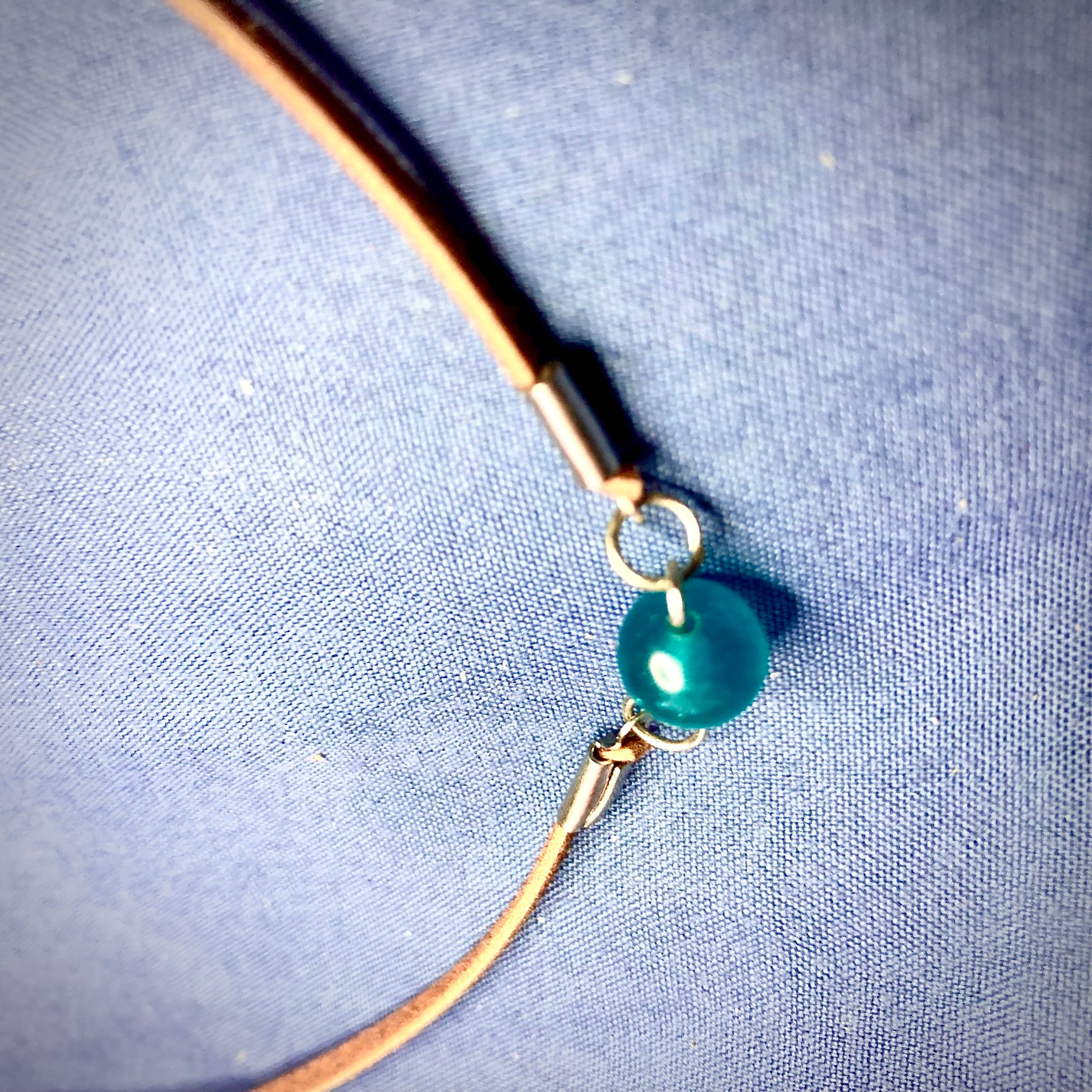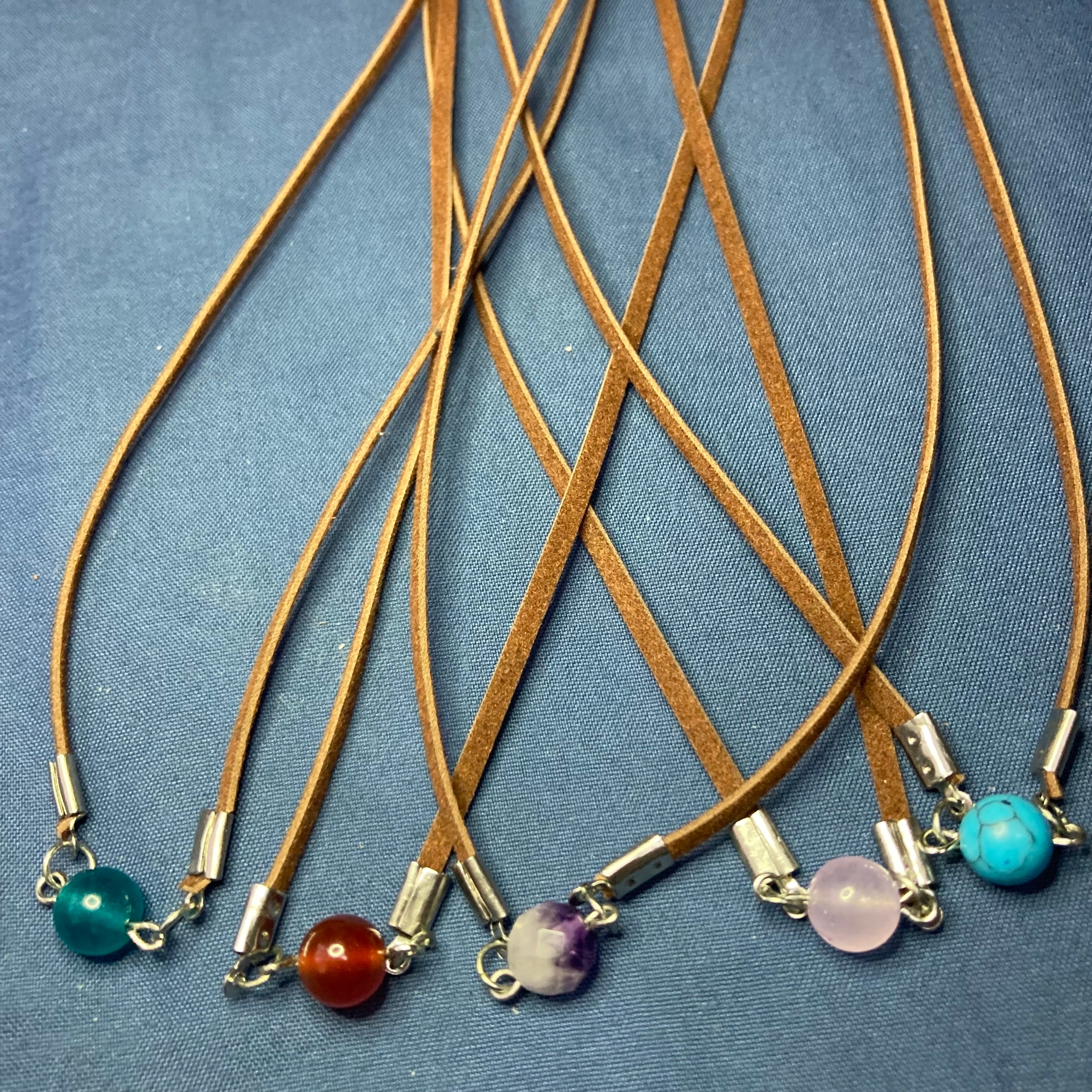 中央部に天然石をあしらった、革紐のネックレスは、2枚あわせの革紐のアクセサリー。