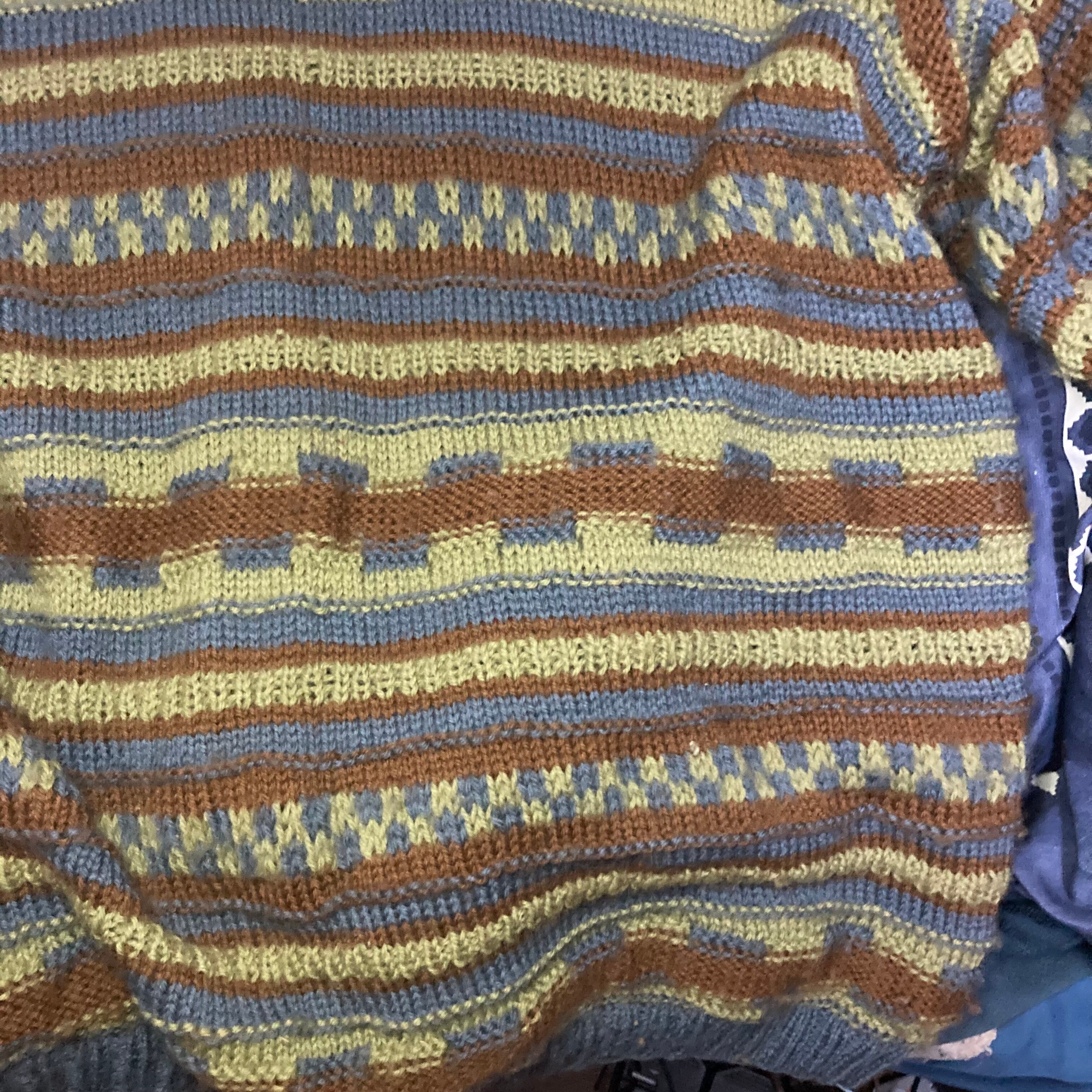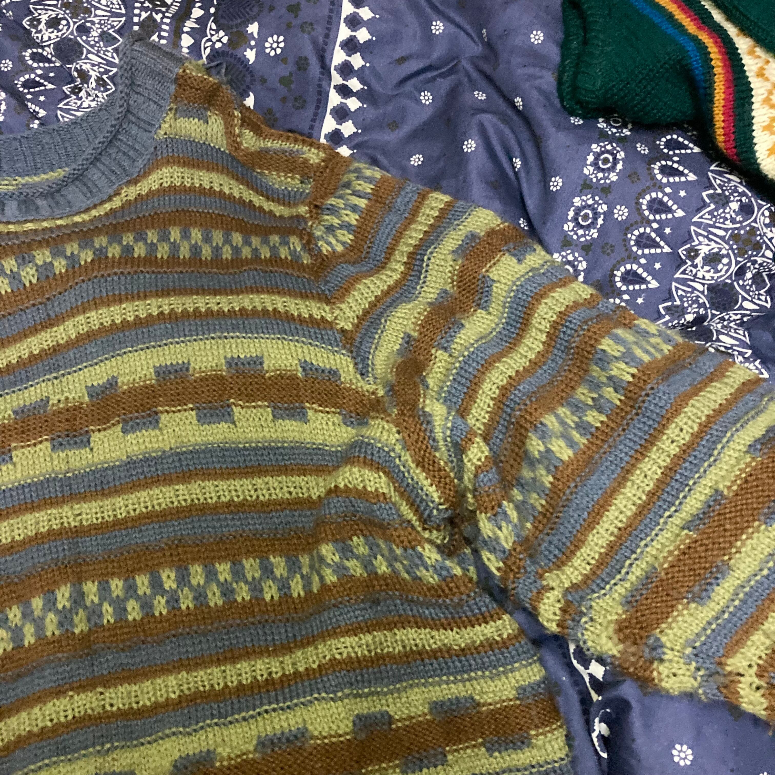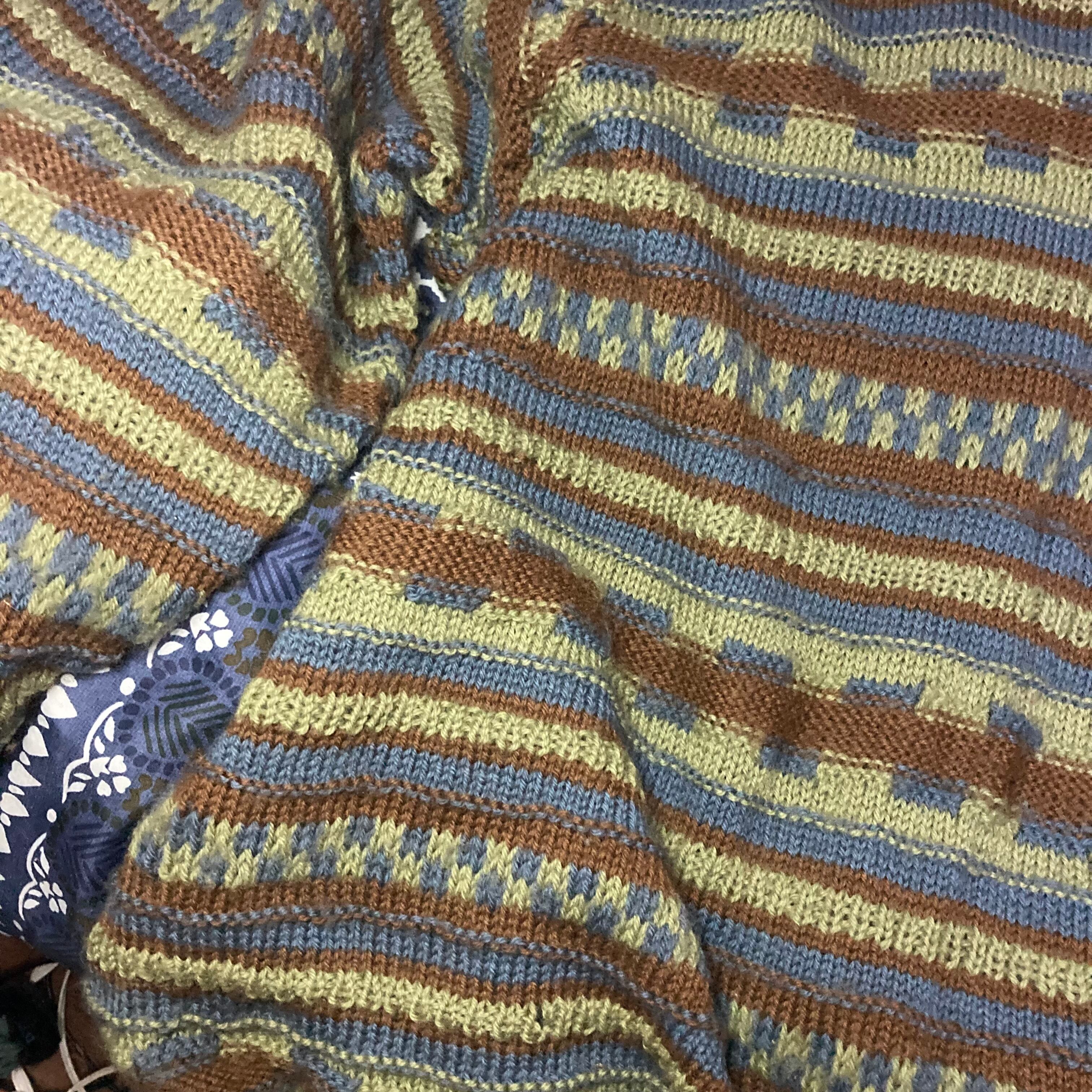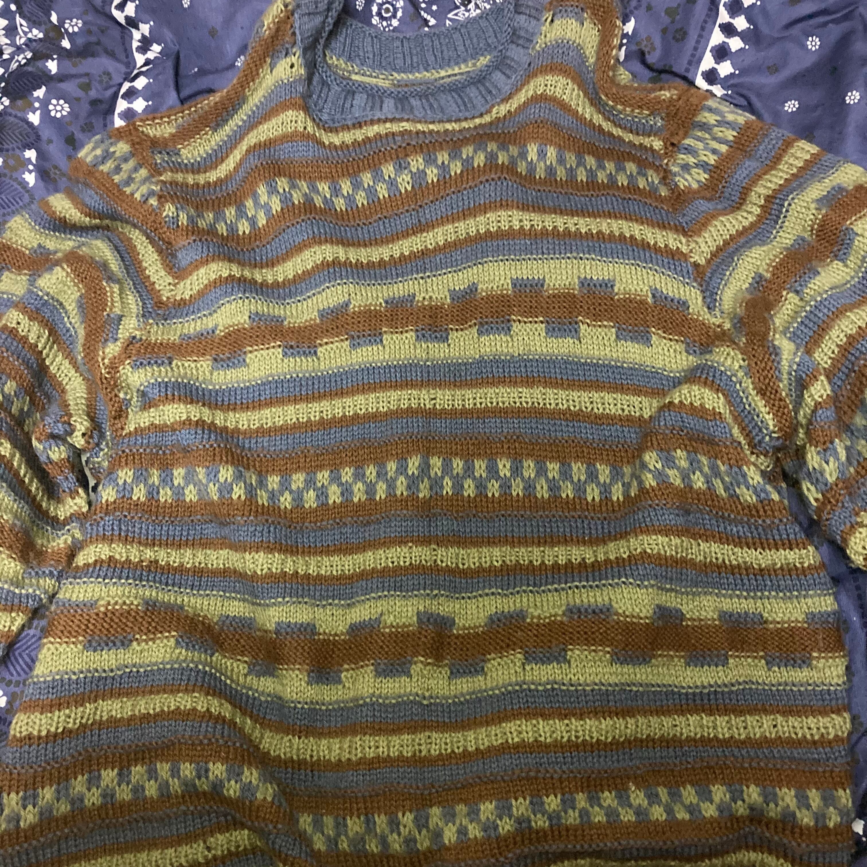 メンズ・セーター・完全オリジナルなボーダー調編み込みセーターカーキグリーンダークシアンの出来上がりです。完全オリジナル柄でもざっくり着れるメンズM-Lサイズです。