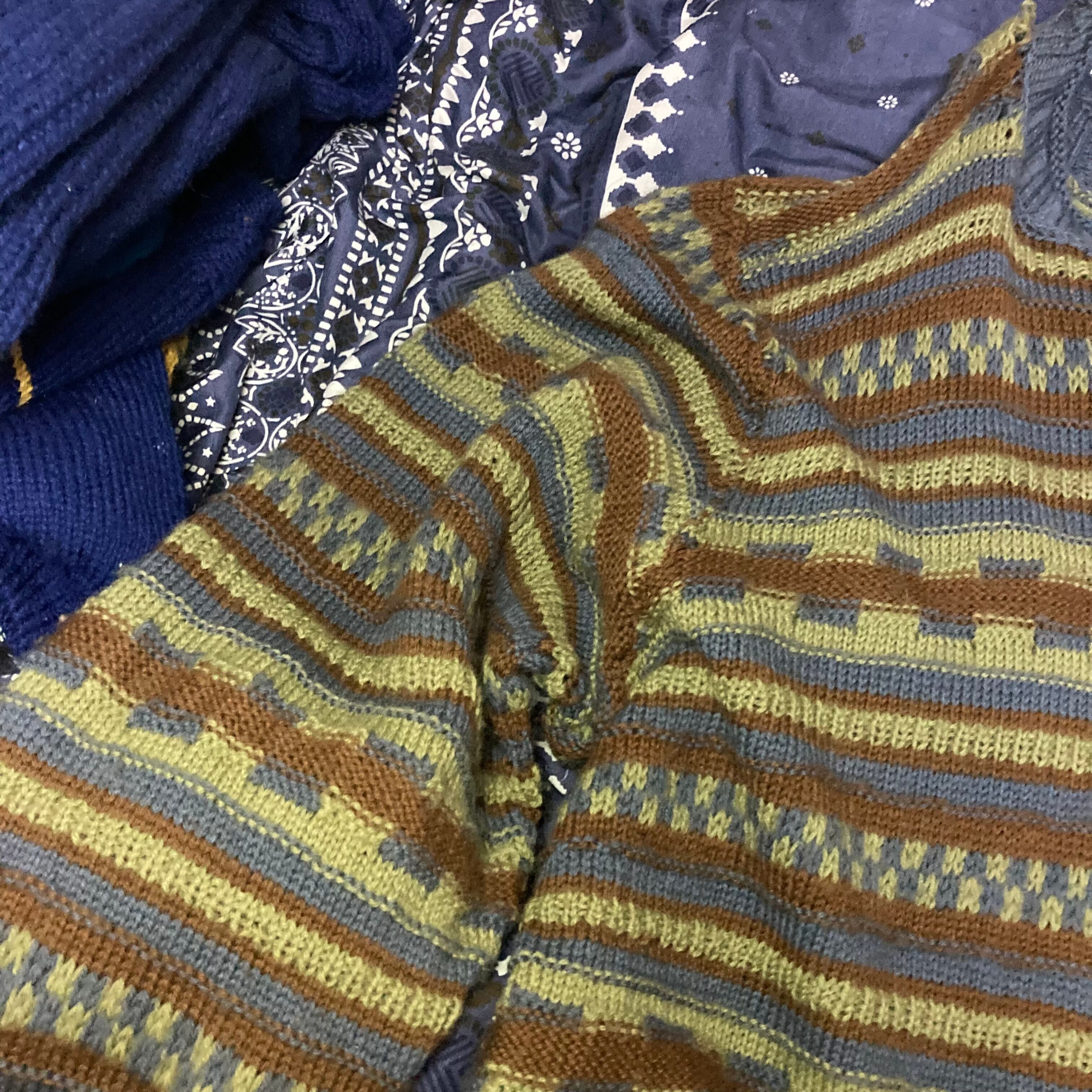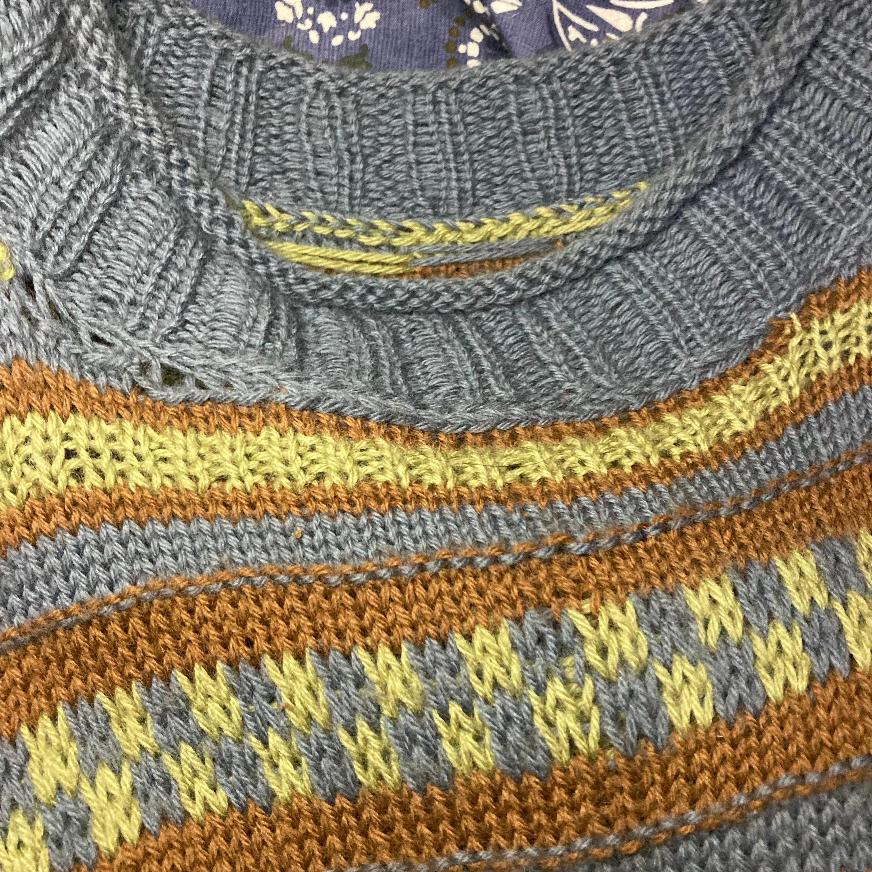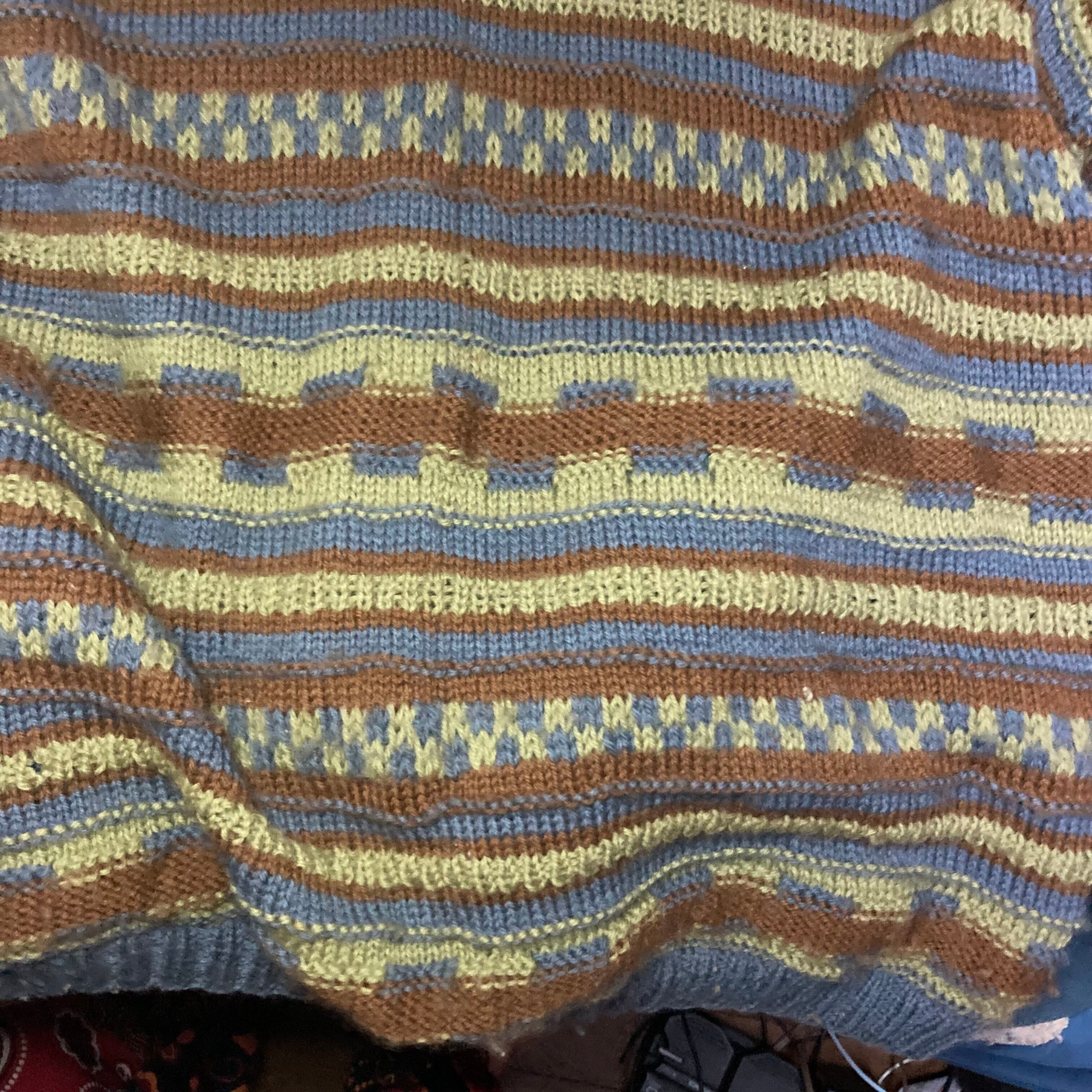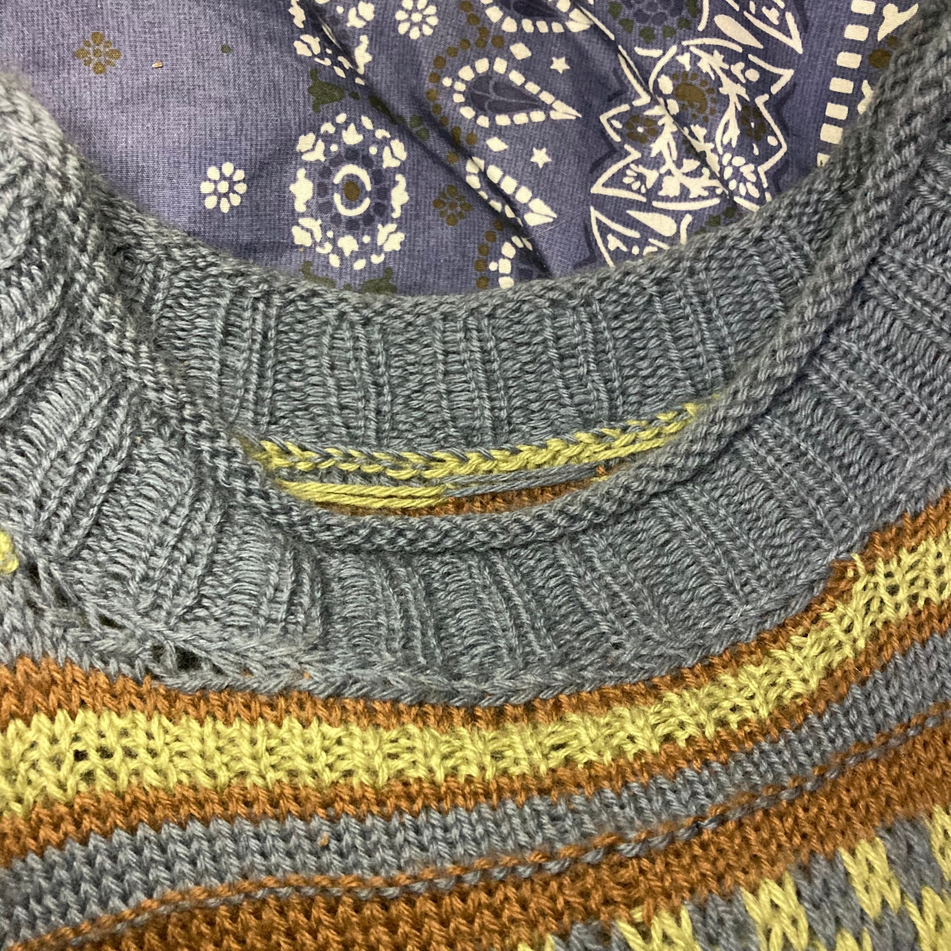 メンズ・セーター・完全オリジナルなボーダー調編み込みセーターカーキグリーンダークシアンの出来上がりです。完全オリジナル柄でもざっくり着れるメンズM-Lサイズです。