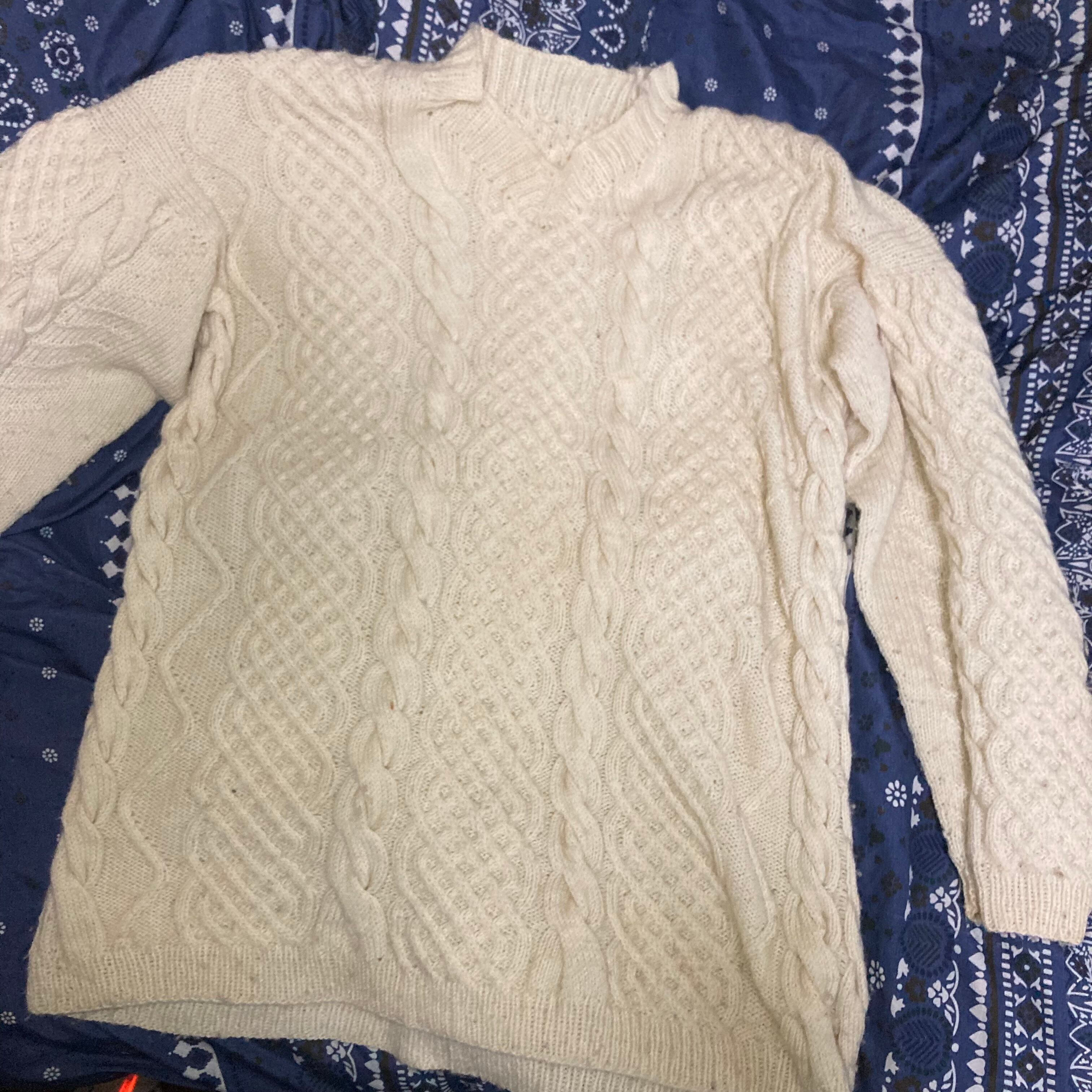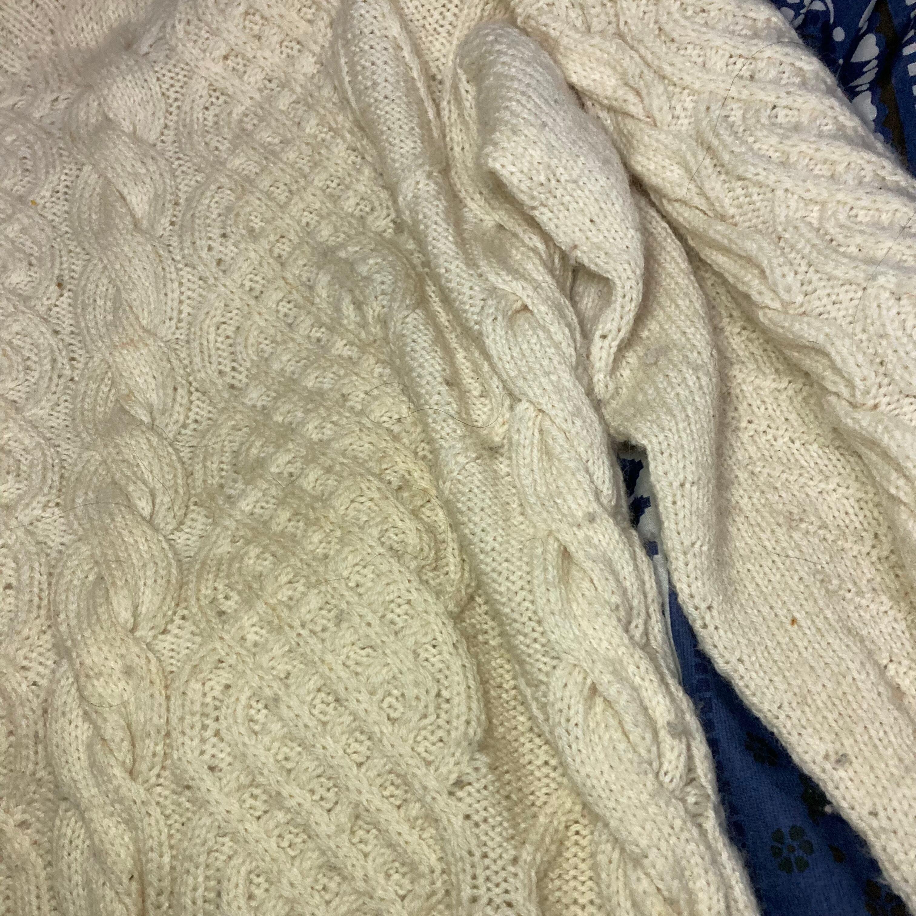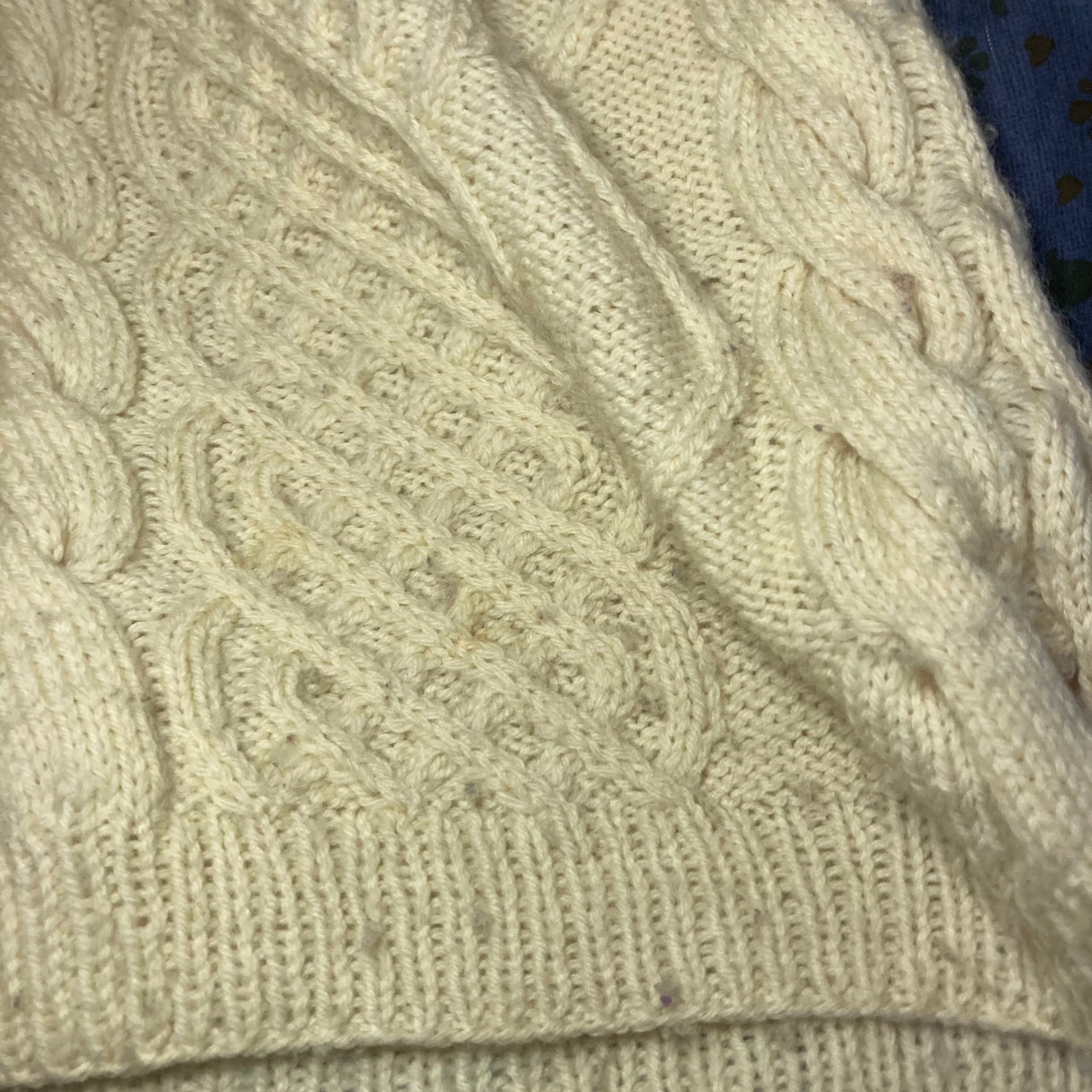 手編みのアランセーター白色ウール100%暖かい毛糸・パーセントを使用。着丈長め、幅広め、ダボっと着るタイプです。オリジナルなアラン模様が特徴的なシンプルセーター、Vネック。